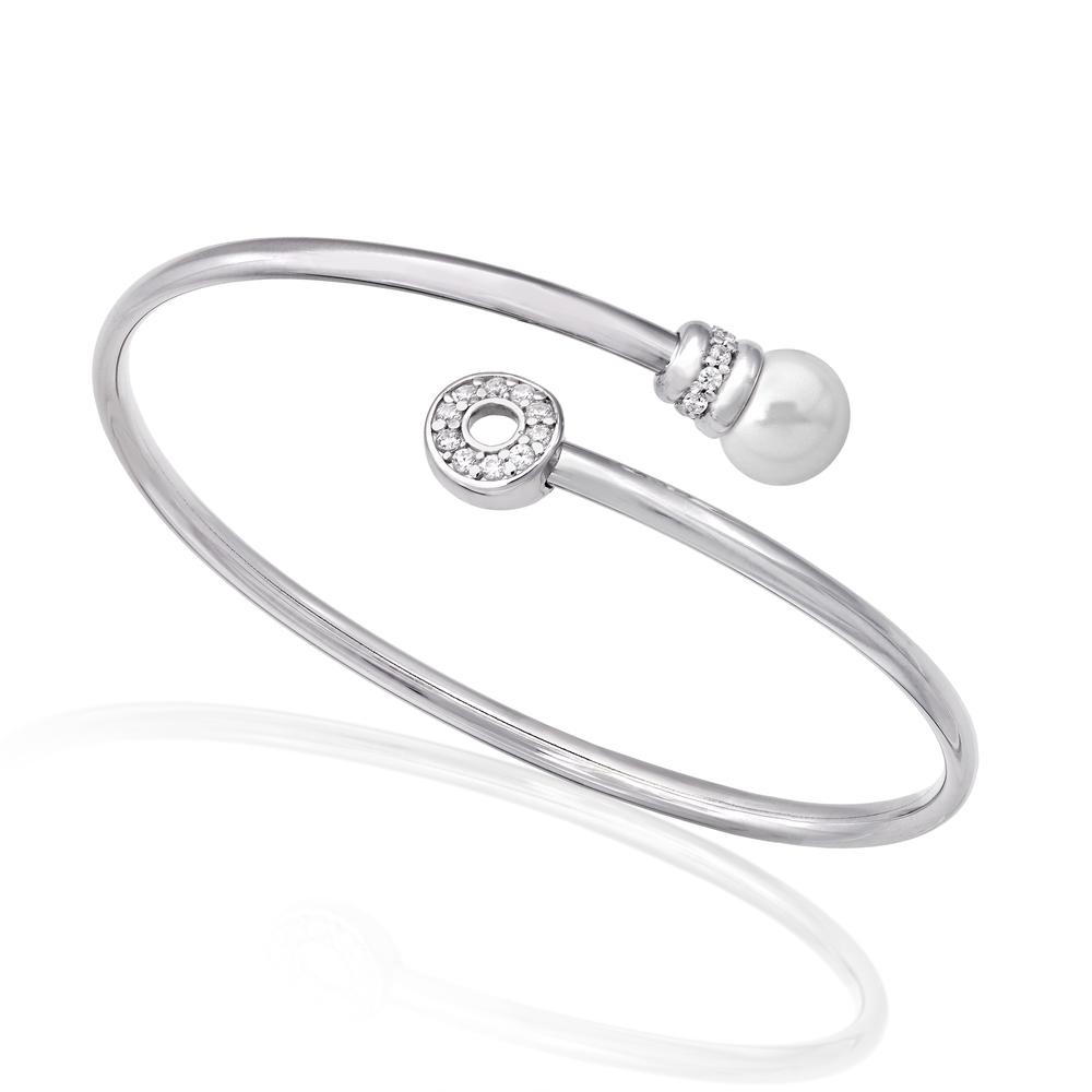Narukvica dimenzija 46x58 mm od rodiniranog srebra s okruglim bijelim biserima promjera 8 mm i cirkonima.