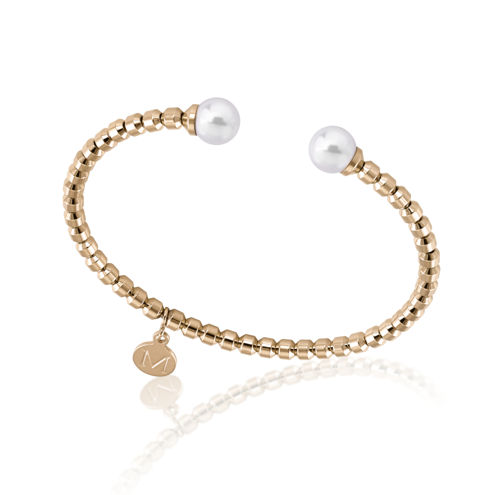 Kruta ogrlica od pozlaćenog čelika dimenzija 50x60 mm s orkuglim bijelim biserima promjera 7 mm.