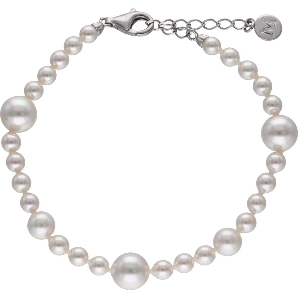 Narukvica od sterling srebra duljine 17 cm s rodijskim premazom. Dizajn sadrži 4, 6 i 8 mm bijele okrugle organske perle, nanizane i čvorovane ručno. Udoban i svestran kopča u obliku jastogove kandže s produžetkom od 3 cm.