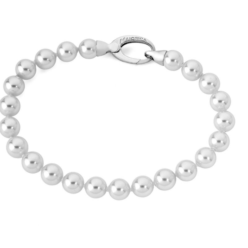 Narukvica s bijelim okruglim biserima promjera 6 mm s kopčom od rodiniranog srebra, dužine 19 cm.