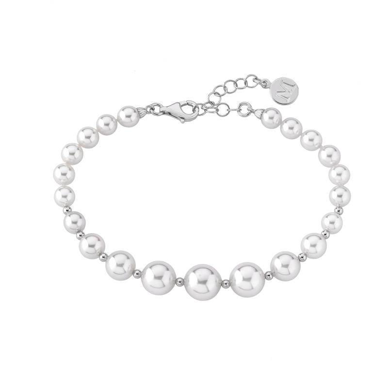 Narukvica od rodiniranog srebra dužine 19/22 cm s okruglim bijelim biserima promjera 6/7/8/9/10 mm.