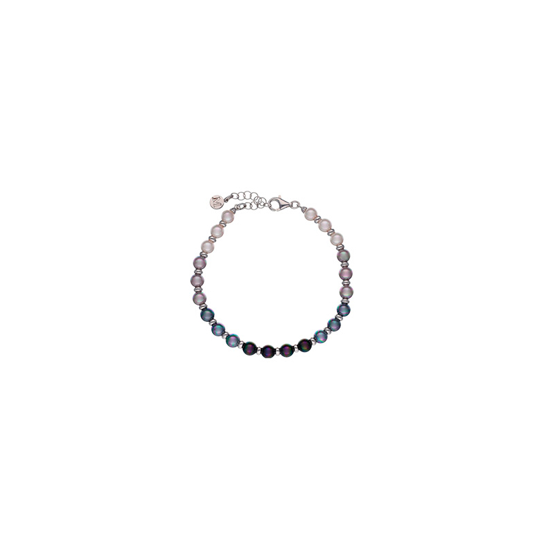 Narukvica gradirajućih boja dužine 19 cm s okruglim bijelim, sivim i crnim biserima promjera 6 mm.
