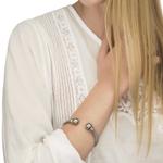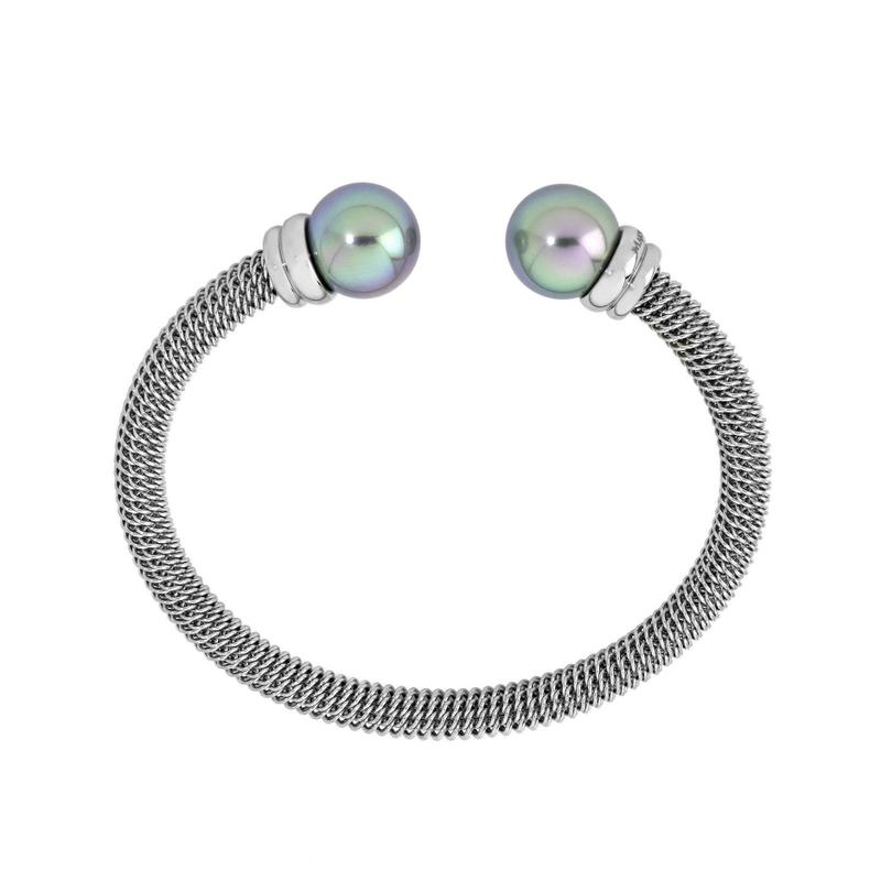 Kruta narukvica od nehrđajućeg čelika s presvlakom od rodija, s okruglim sivim biserima promjera 12 mm.