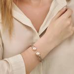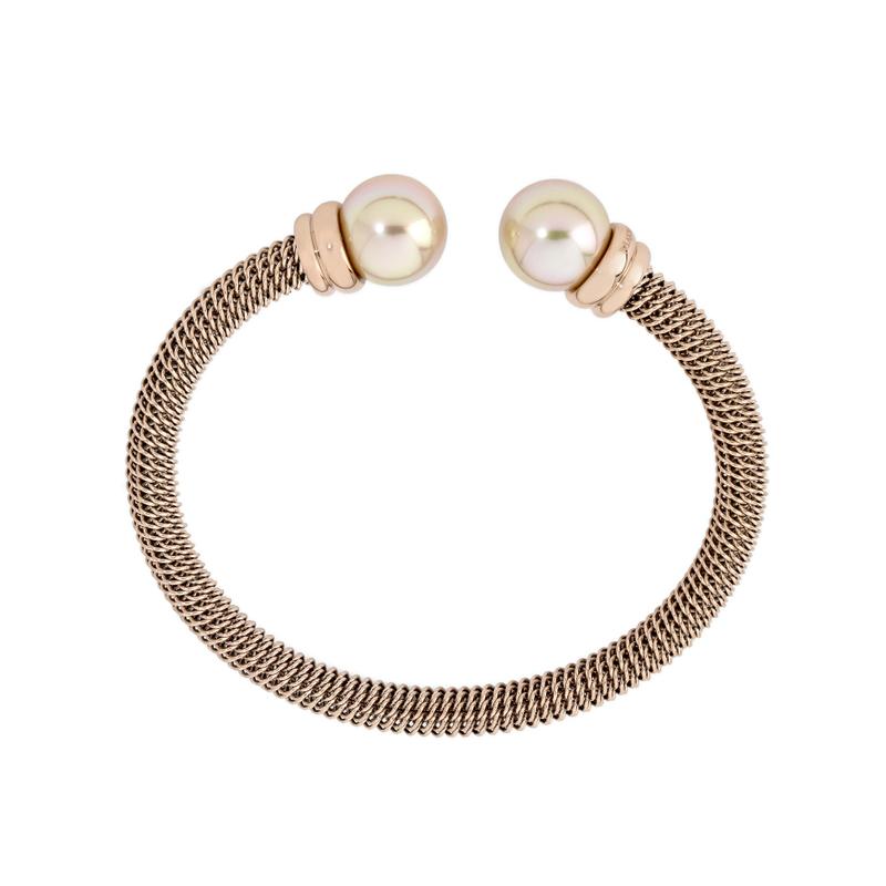 Kruta narukvica od nehrđajućeg čelika s presvlakom od ružičastog 18 karatnog zlata, s okruglim biserima boje lososa promjera 12 mm.