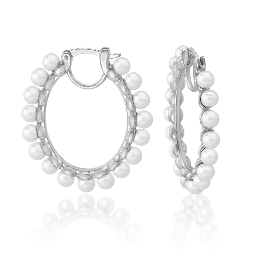 Naušnice u obliku većeg koluta od rodiniranog srebra s malenim biserima 4 mm promjera iz kolekcije Ada. Može ih se kombinirati s drugim nakitom Majorica. Ženstvena i vječna elegancija.