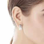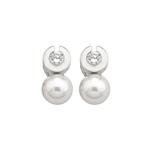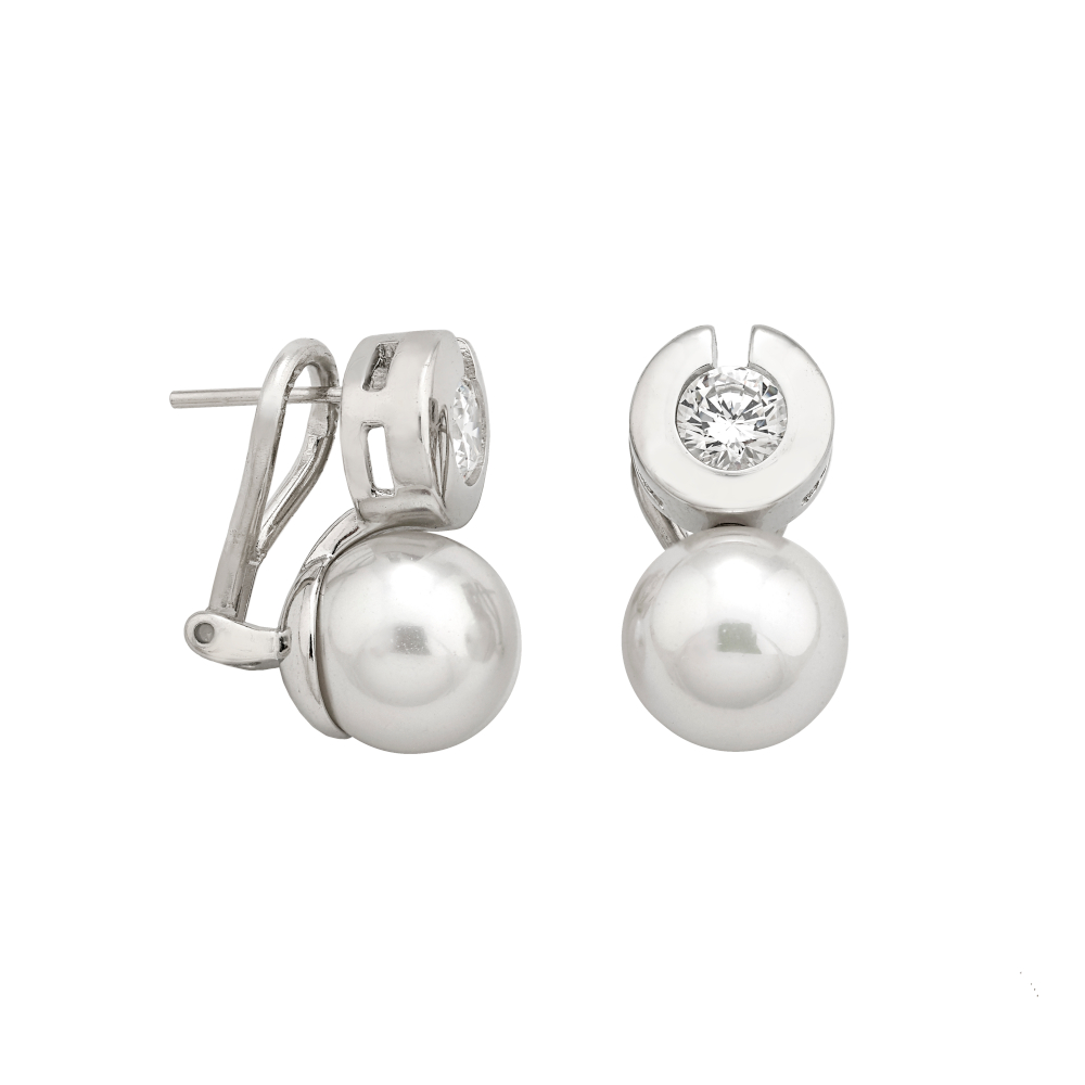 Naušnice na omega kopču s iglom od rodiniranog srebra s okruglim bijelim biserima promjera 10 mm i cirkonima.