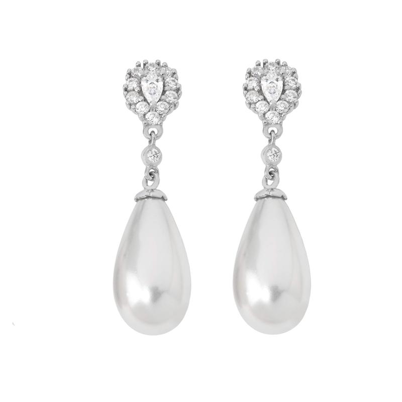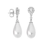 Naušnice viseće, kopča s iglom, srebrne s presvlakom od rodija, s bijelim biserima u obliku suze od 20x12 mm i cirkonima.