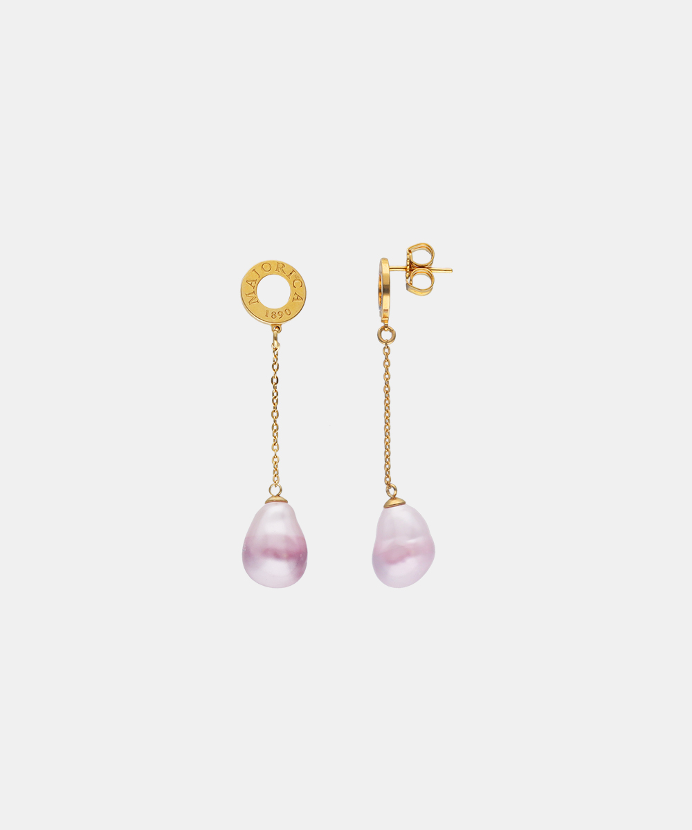 Viseće naušnice s kopčom na iglu od pozlaćenog srebra i kruškolikim baroknim biserom promjera 12 mm i boje rubina.