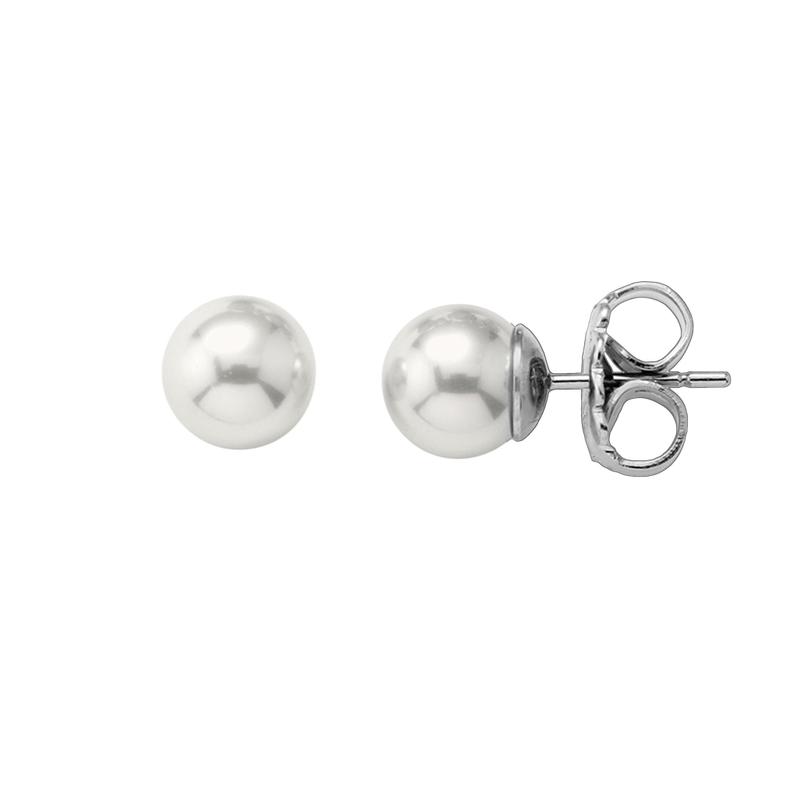 Naušnice s kopčom na iglu od rodiniranog srebra s okruglim bijelim biserima promjera 8 mm.