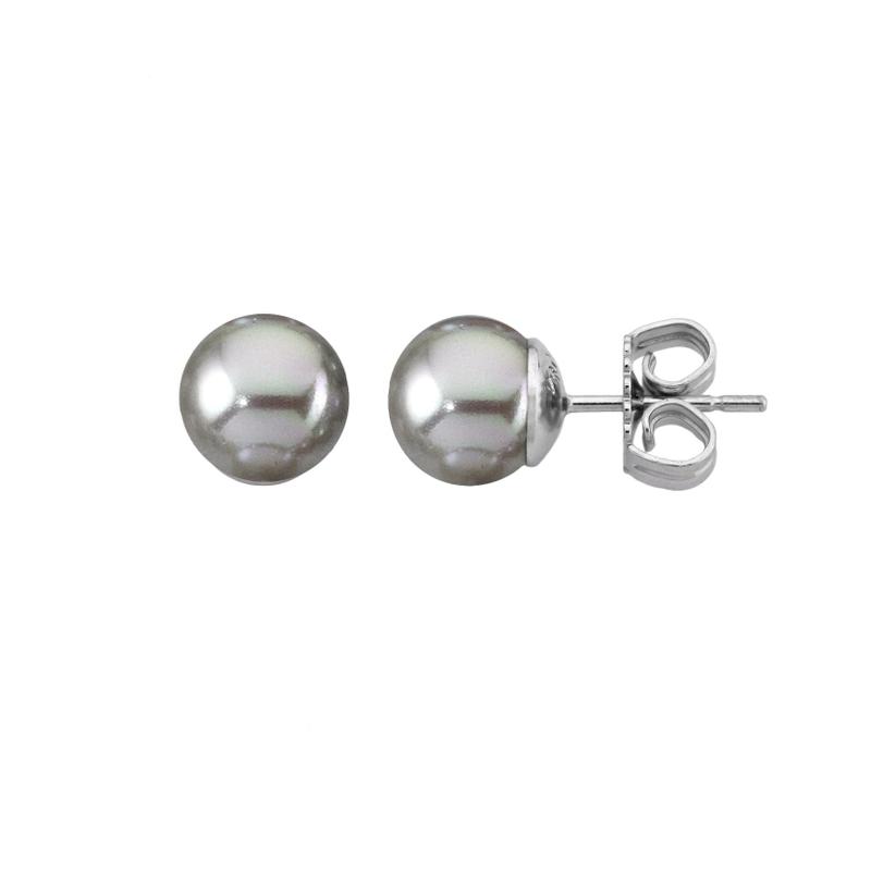 Naušnice s kopčom na iglu od rodiniranog srebra s okruglim sivkastim biserima promjera 10 mm.