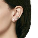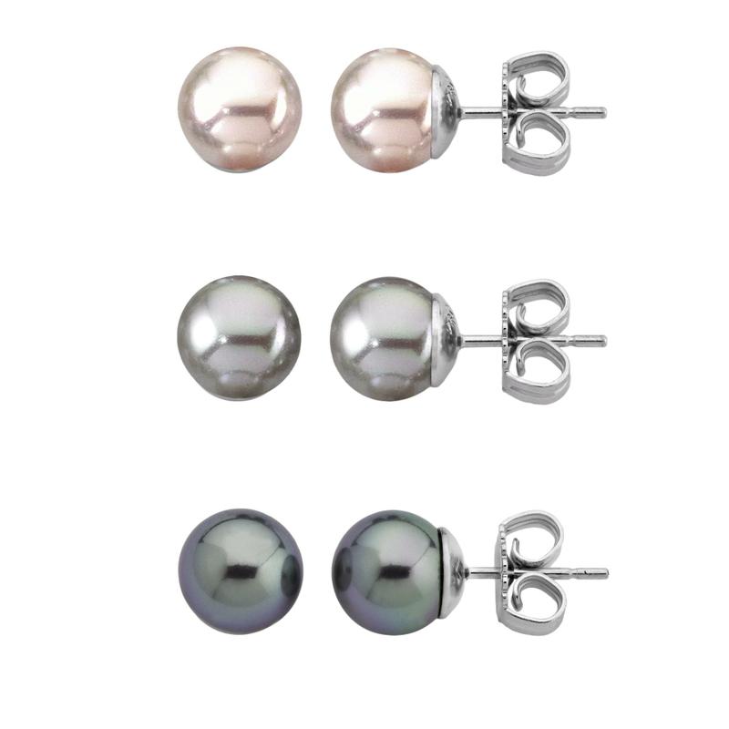 Set od tri para naušnica na kopču s iglom od rodiniranog srebra s okruglim roza, sivkastim i sivim biserima promjera 8 mm.