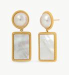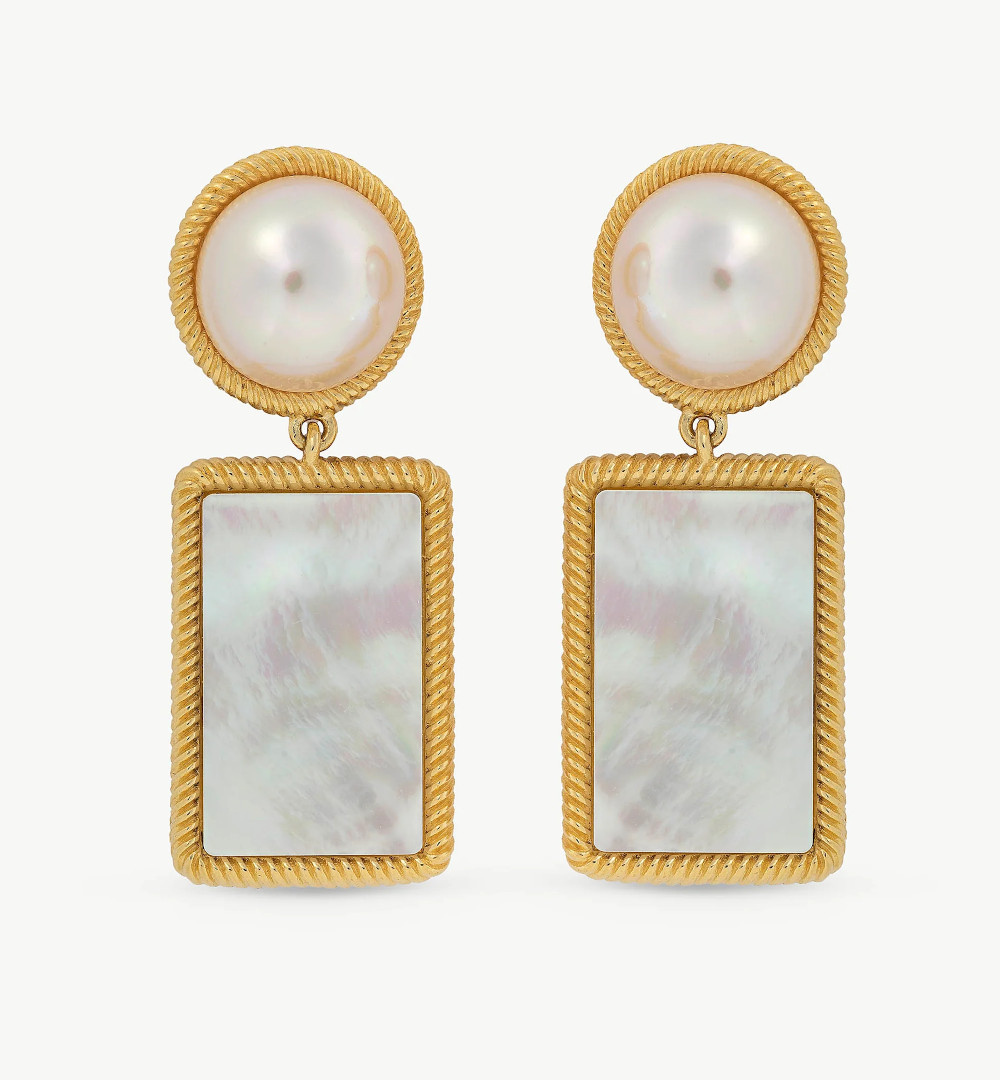Zlatom pozlaćene srebrne duge naušnice s majčinim biserom i bijelom polukuglastom bisernom perlom promjera 12 mm.