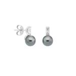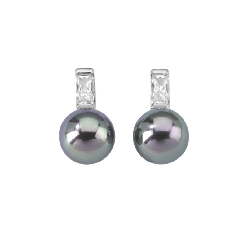 Naušnice kratke, kopča s iglom, srebrne s presvlakom od rodija, s okruglim sivim biserima od 8 mm i cirkonima.