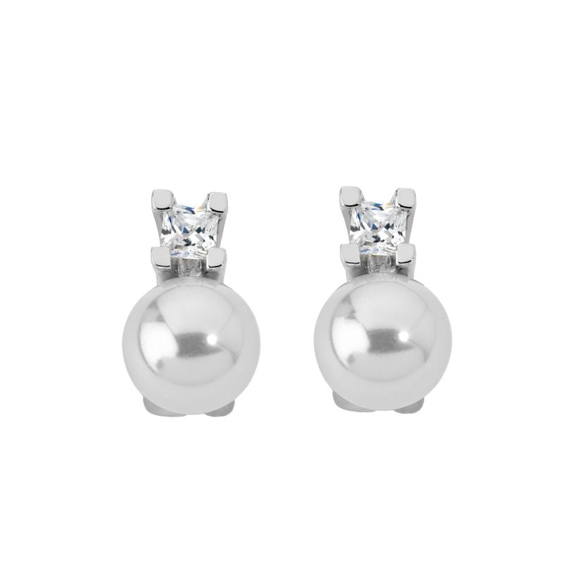 Naušnice kratke, kopča s iglom, srebrne s presvlakom od rodija, s okruglim bijelim biserima od 8 mm i cirkonima.