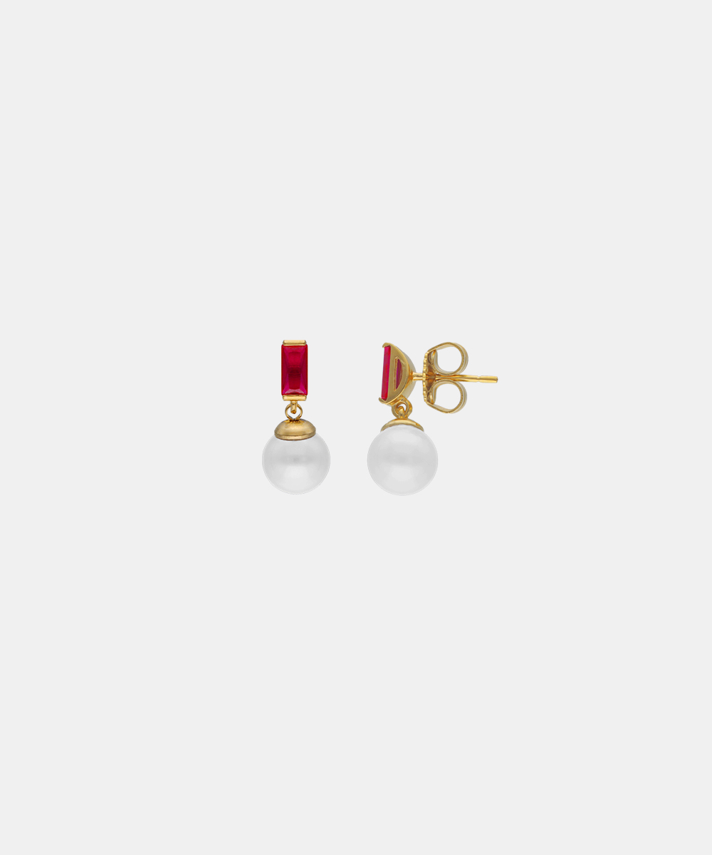 Naušnice Tu&Yo od pozlaćenog srebra na kopču s iglom s okruglim bijelim biserima promjera 8 mm i crvenim rubin cirkonom.