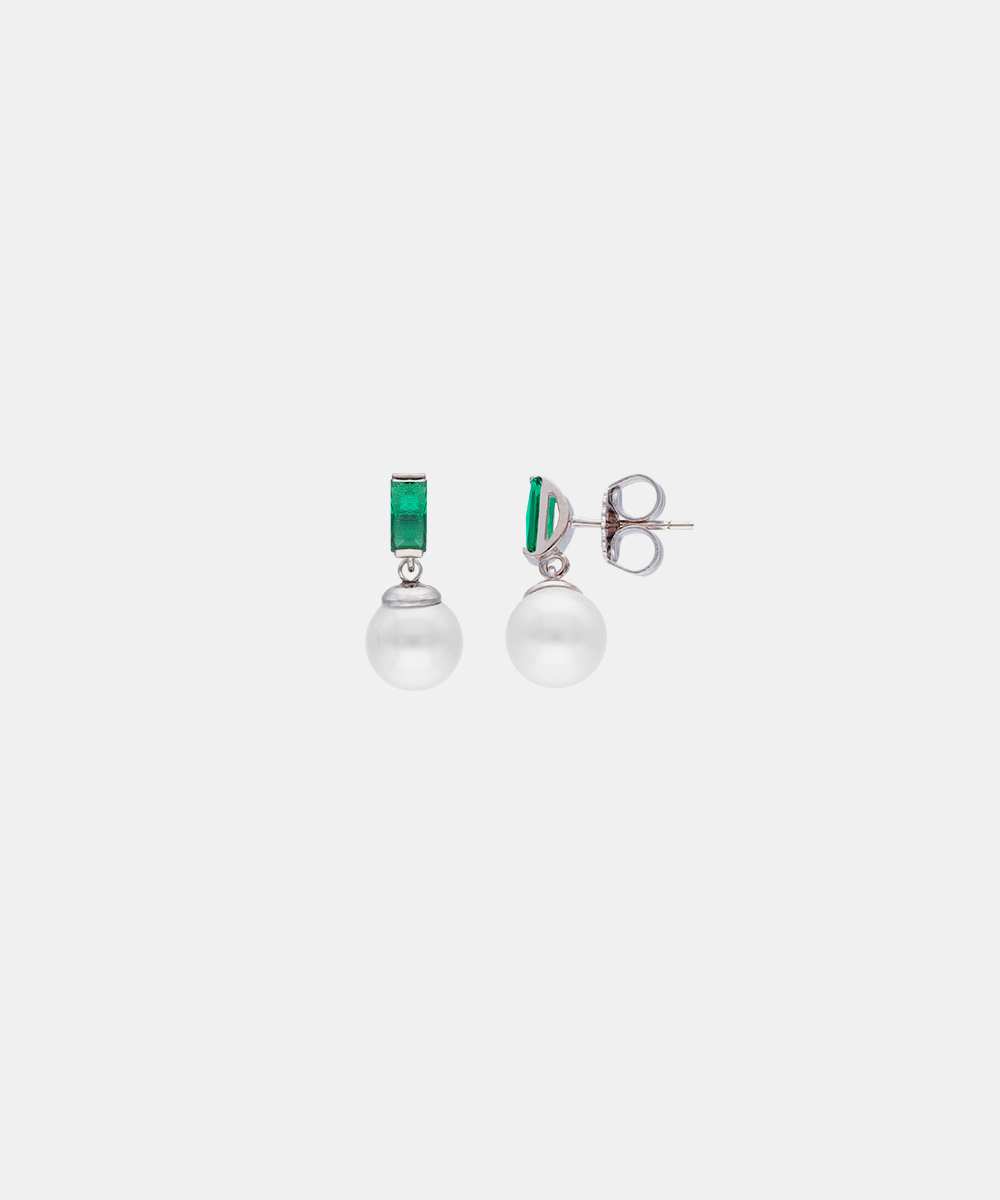 Naušnice Tu&Yo od pozlaćenog srebra s kopčom na iglu, okruglim bijelim biserima promjera 8mm i cirkonom boje zelenog smaragda.
