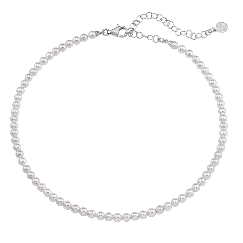 Ogrlica dužine 34/40 cm od rodiniranog srebra s okruglim bijelim biserima promjera 4 mm.