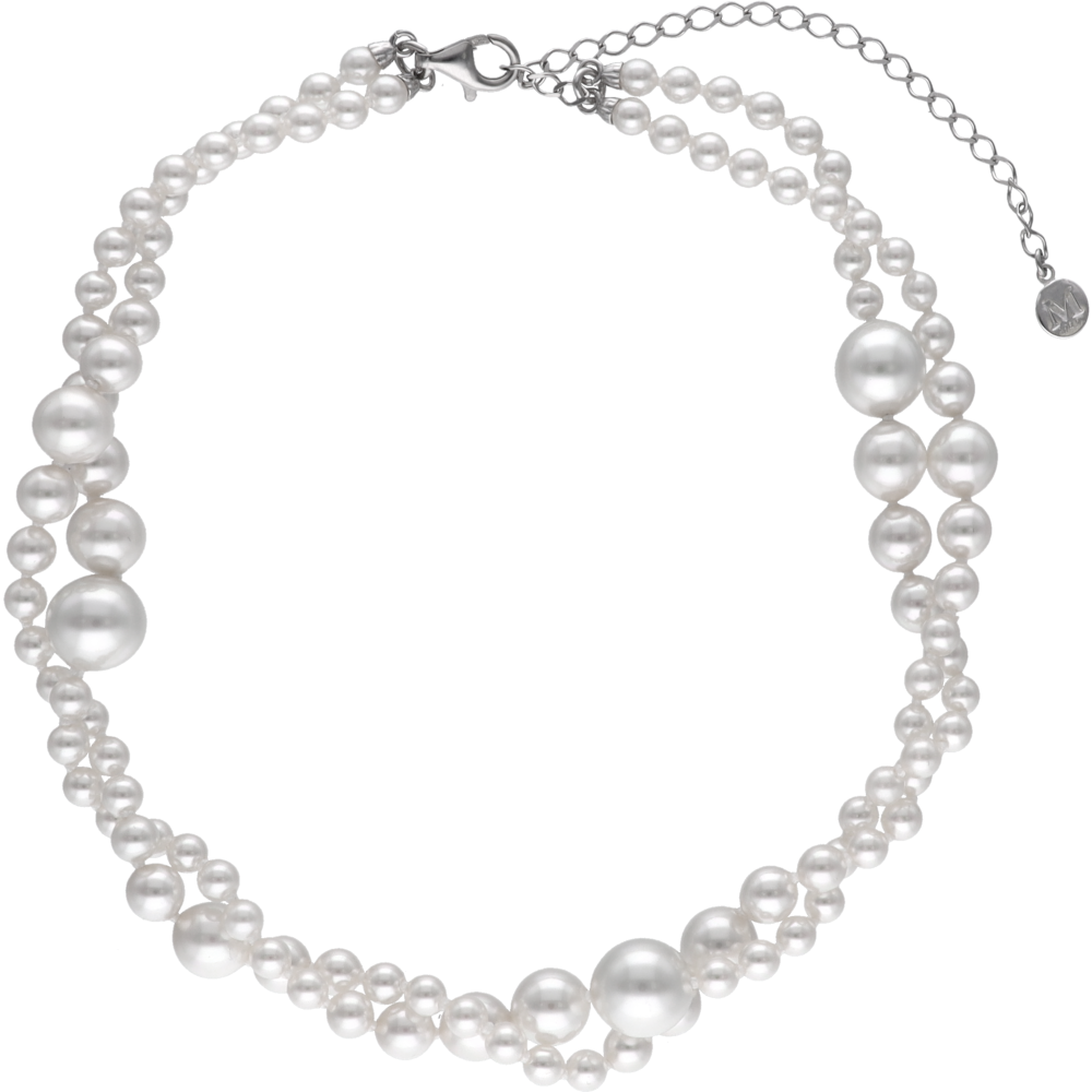 32 cm kratka ogrlica od sterling srebra s dvostrukim nitima, kopčom u obliku škampa i produžetkom od 8 cm. Nizana i čvorovana ručno s okruglim organskim bijelim biserima veličine 4, 5, 6, 7, 8 i 10 mm.