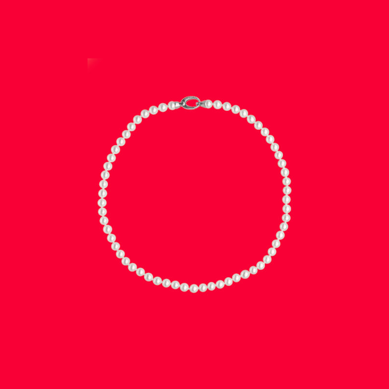 Ogrlica dužine 45 cm od rodiniranog srebra s okruglim bijelim biserima promjera 6 mm.