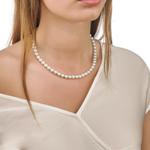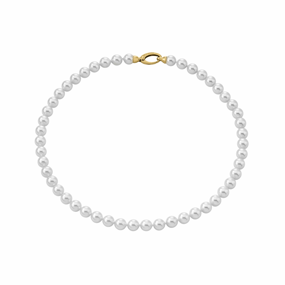 Ogrlica dužine 45 cm s okruglim bijelim biserima promjera 7 mm i presvlakom od žutog zlata.