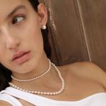 Ogrlica dužine 45 cm s okruglim bijelim biserima promjera 7 mm i presvlakom od rodija.