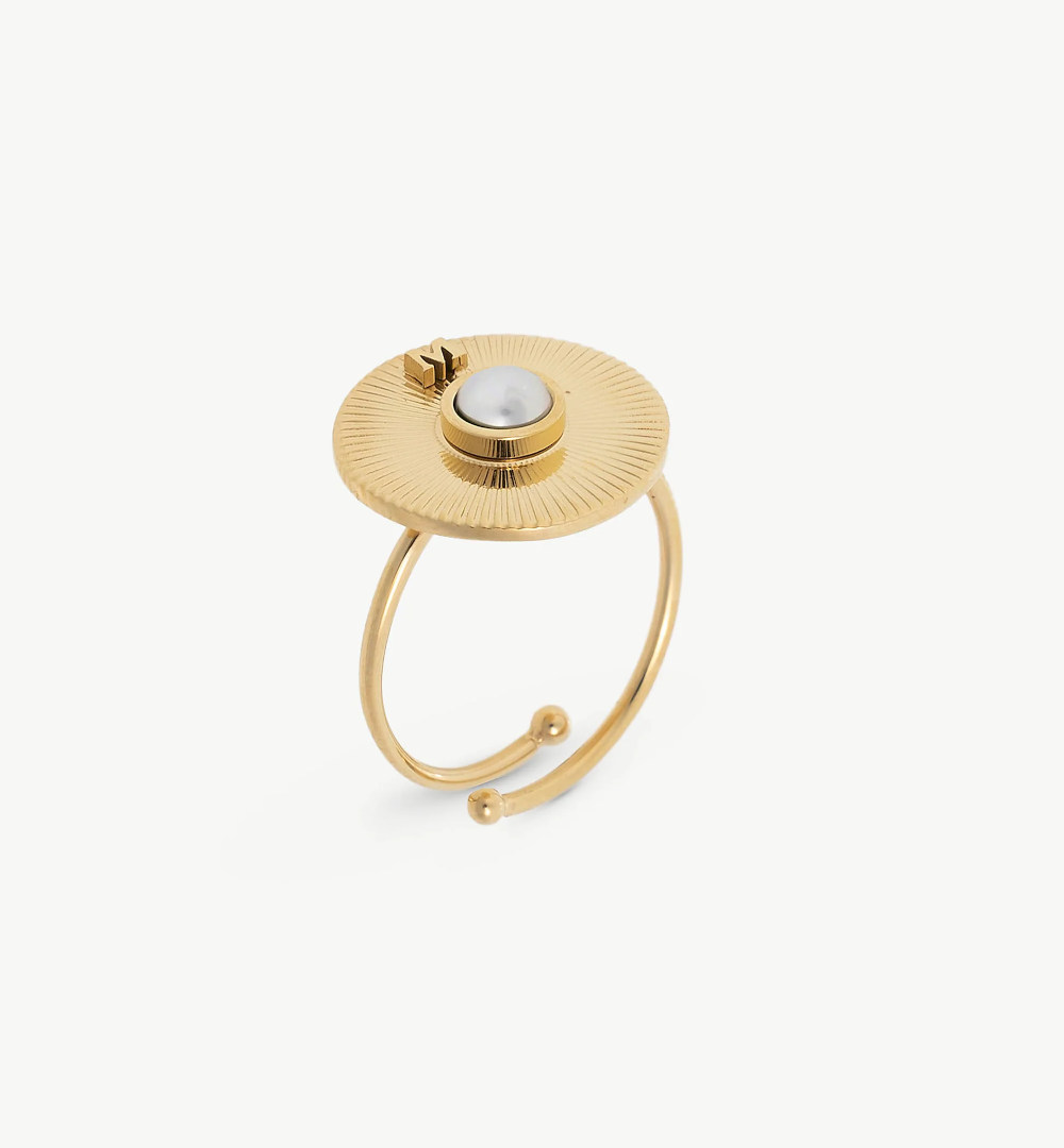 Podesivi zlatni čelični prsten s polu kuglastom bijelom bisernom perlom promjera 4 mm. Veličina 92