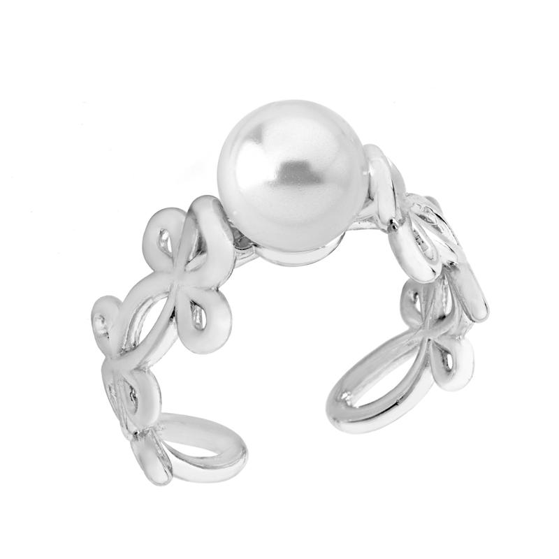 Otvoreni prsten od rodiniranog srebra s okruglim bijelim biserom promjera 8 mm. Veličina: 57-59