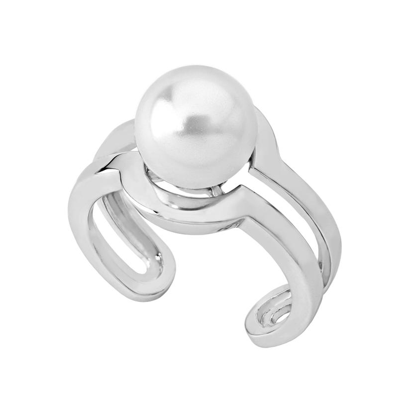 Otvoreni prsten od rodiniranog srebra s poluokruglim bijelim biserom promjera 10 mm. Veličina: 57-59