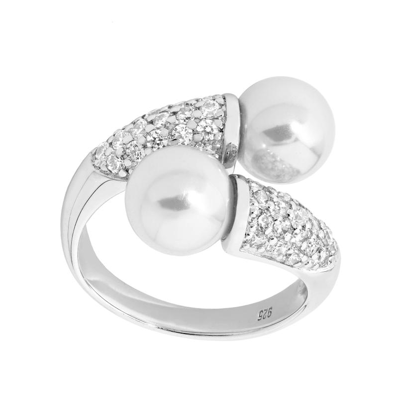 Otvoreni prsten od rodiniranog srebra s okruglim bijelim biserom promjera 8 mm i cirkonima.Veličina: 53-55
