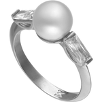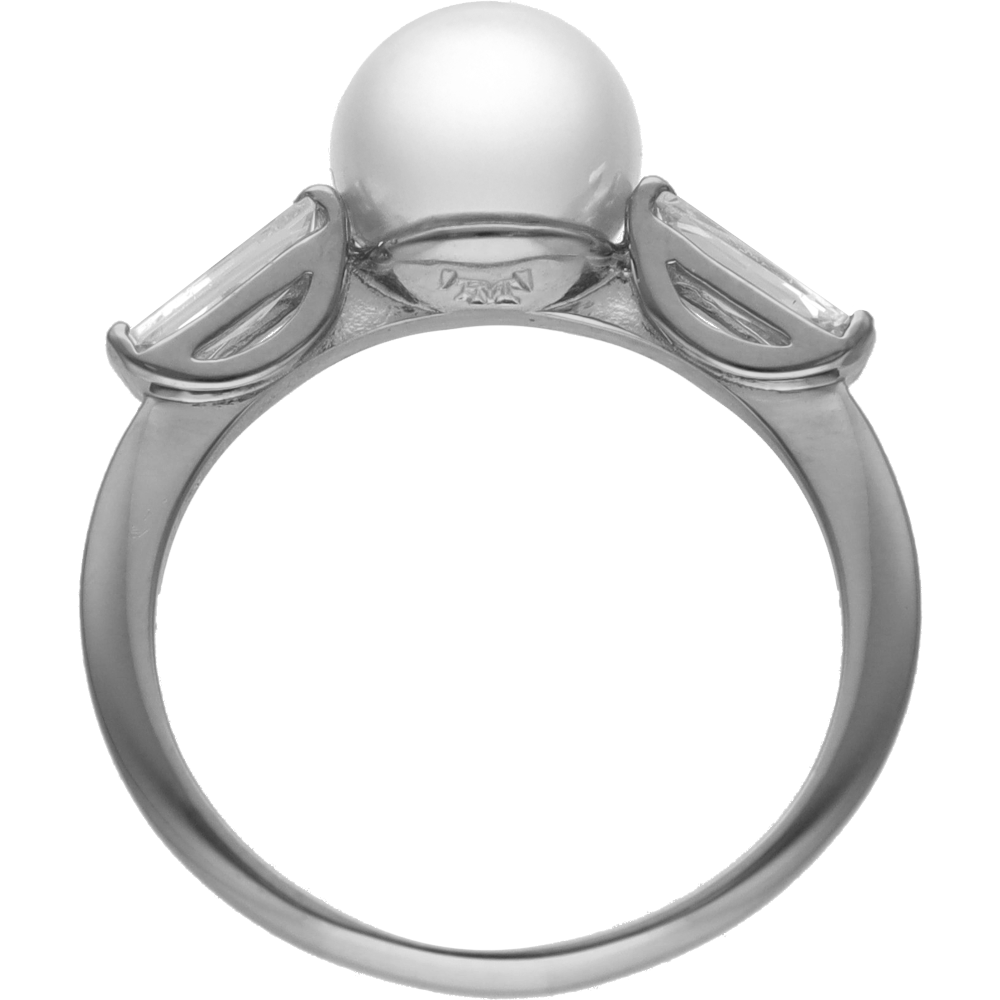 Prsten od sterling srebra pozlaćen rodiom. Dizajn uključuje bijelu organsku bisernu kuglu promjera 8 mm uz dva cirkona u obliku baguettea. Veličina 15